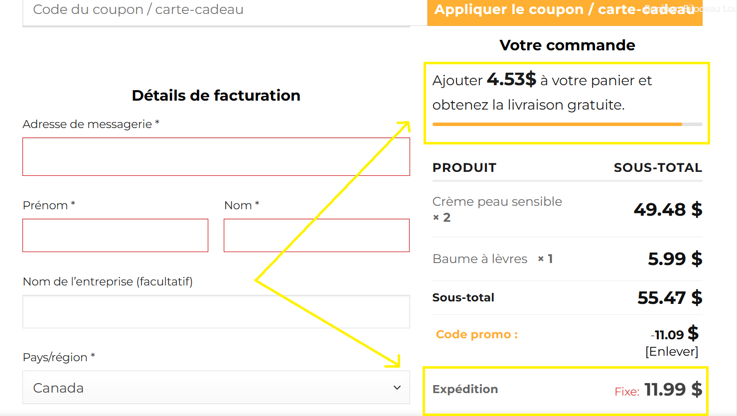 1. Vérifiez si votre panier se retrouve en dessous de 60$ avant taxes après application du code promo. Les frais de livraison de 11,99$ s'appliquent pour tout panier de 60$ avant taxes. Si votre code promo fait descendre votre panier en dessous de 60$ avant taxes, cela explique pourquoi les frais de livraison s'appliquent automatiquement.