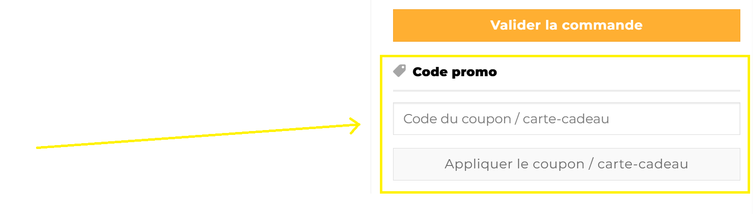En plus de la section Panier, il est possible d'appliquer un code promo dans la section Détails de la commande. (Page de paiement). Suite à l'insertion de celui-ci, il faudra ensuite cliquer sur l'onglet Appliquer le coupon / carte cadeau. Vous devriez ensuite voir la réduction apparaitre dans le sous total du montant à acquitter.
