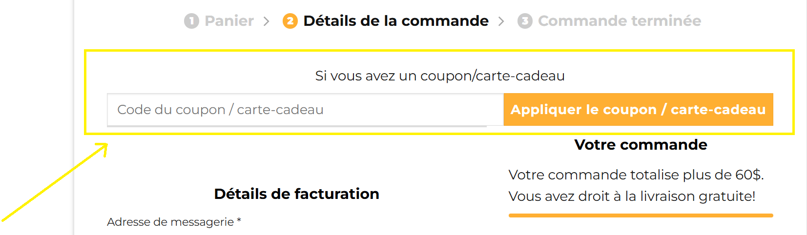 Attention: Le panier doit être minimalement à 60$ avant taxes après application de tout coupon de réduction pour pouvoir bénéficier de la livraison gratuite.